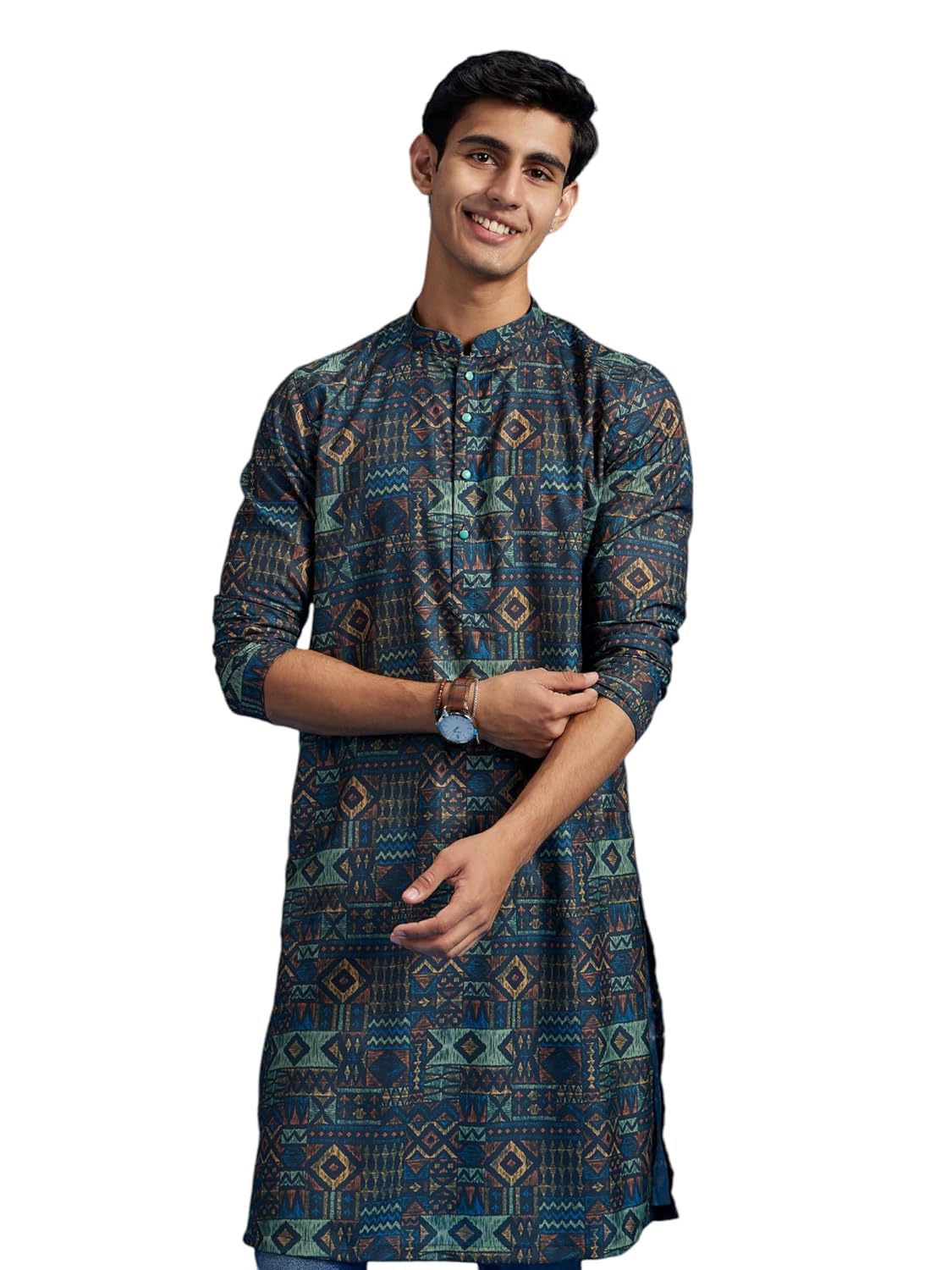 DIWAS by Manyavar Men’s Blended Viscose Printed Kurta (Teal Blue,S)
